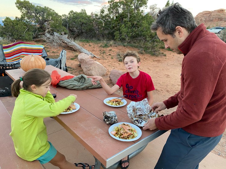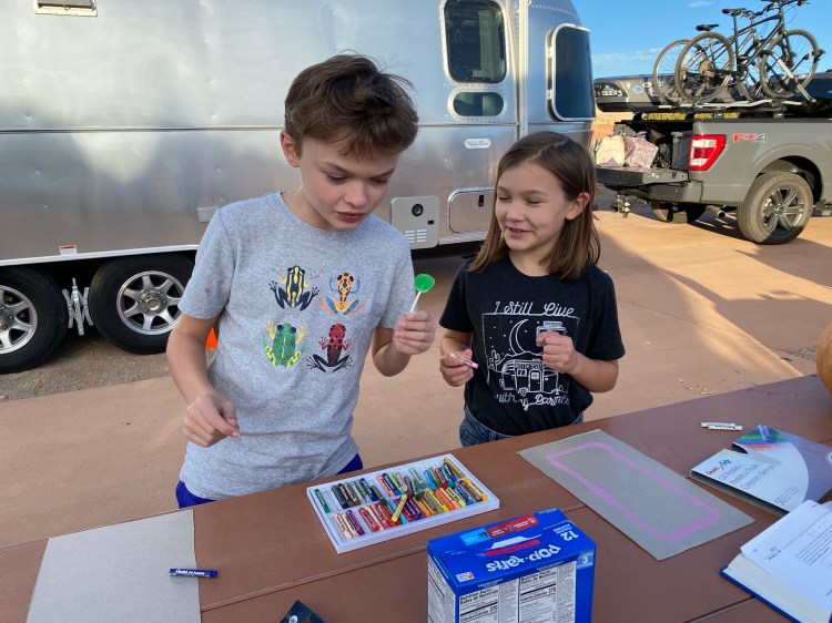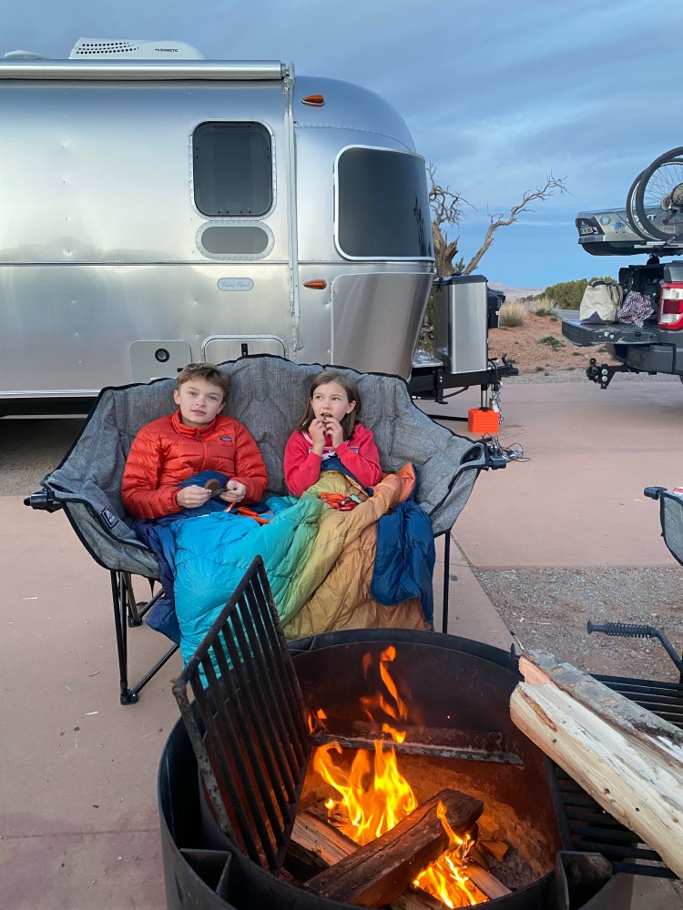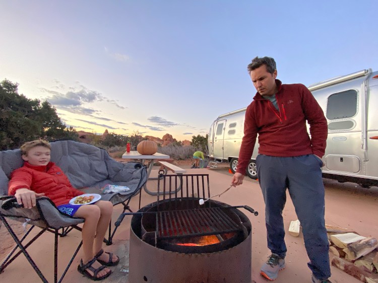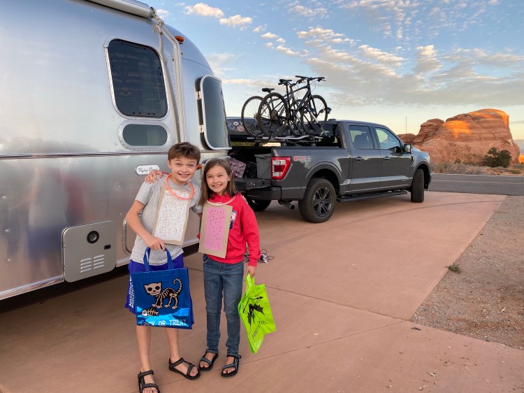 In the first hours of our arrival at Devil’s Garden — after the kids had had some time to climb and run and leap across the irresistible sandstone fins — we began prepping for Halloween. It was October 31st, and we’d been brainstorming ideas for costumes for the last couple of days. We settled on an idea that included the Airstream and honored one of the kids’ favorite camping breakfast foods. The kids were pop-tarts and the Airstream was a toaster. We grabbed a box of cereal at the grocery store in Moab and cut a large panel off for each kid. Graham made his cardboard into a blueberry pop-tart; Emma was strawberry. We taped the pop-tart cardboards onto each child, opened the bags of candy they’d been waiting on (thanks Judy!) and built a fire in our fire pit. There were only a few other campsites with kids in residence, so the trick-or-treating was light, but the atmosphere in the small campground was festive and warm. We noticed some pumpkin decorations and admired a handful of costumes, and retired to our campsite early to eat candy by the fire.