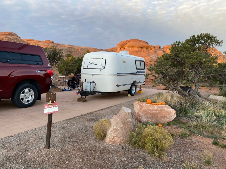 At Arches National Park, we were lucky to get a campsite at Devil’s Garden Campground at the far end of the park, maybe half an hour from the entrance, within walking distance of the popular Devil’s Garden trailhead — not only that, but we unknowingly booked one of the few sites (22) situated at the top of the hill near the amphitheater where there is cell signal and solid (with a booster) internet. All this means good access to both hiking and remote work!