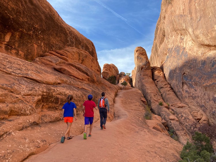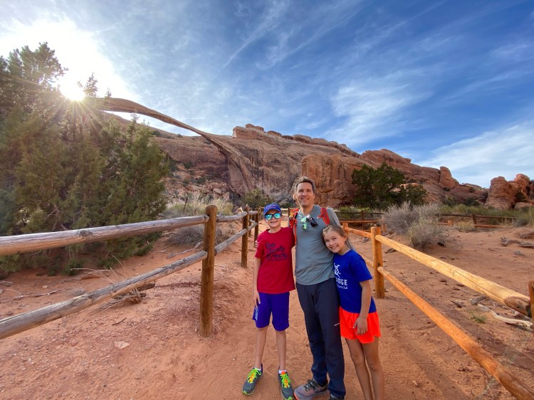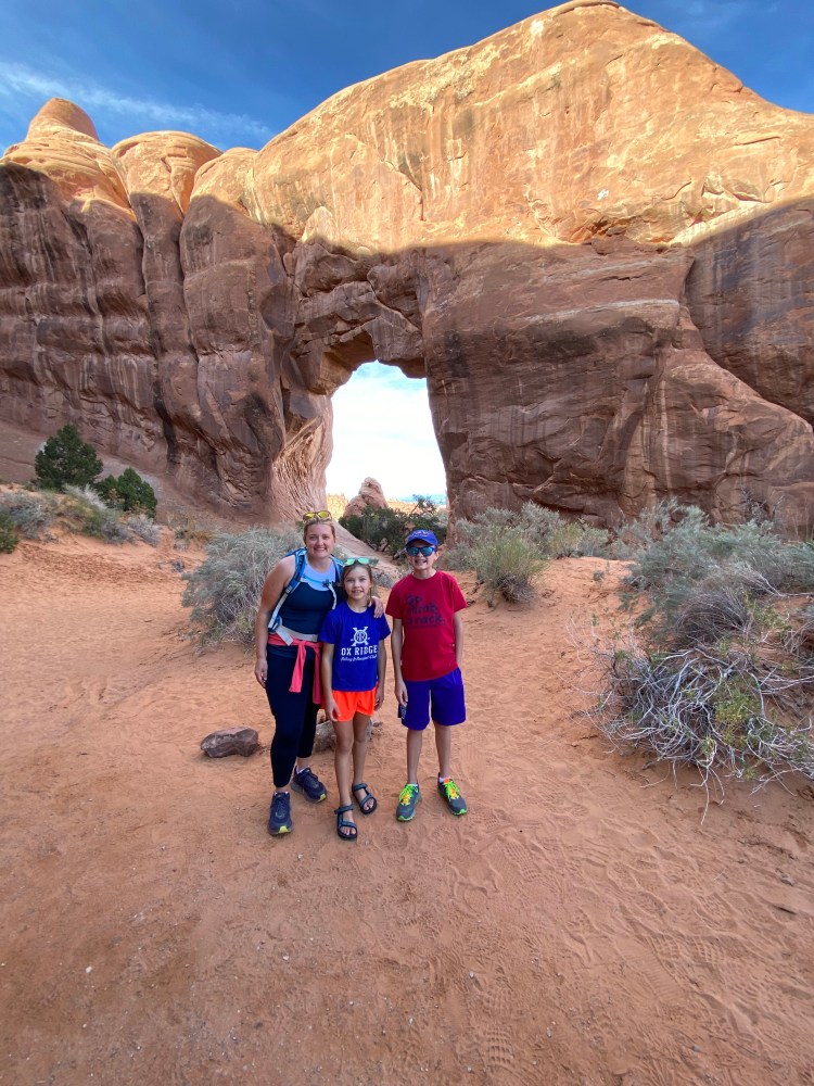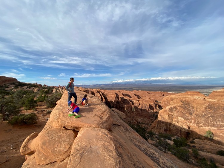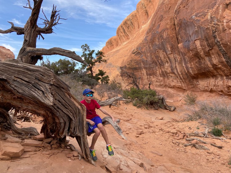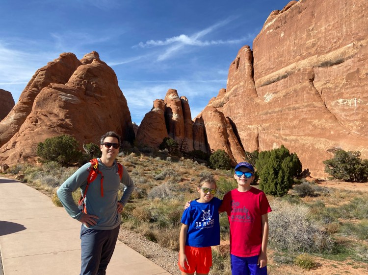 There are several ways you can hike the trails at Devil’s Garden Trailhead. In total, the trails form an approximately 8 mile loop, with some spurs you can venture down to view additional rock formations. A couple miles of that loop are the Primitive Trail, which is rated as difficult; the Park Service says “the obstacles in this segment include difficult route finding, steep slopes, narrow drop-offs, and rock scrambling. Hiking the Primitive Trail requires crossing a pool that may contain water.” Without the Primitive Trail segment, we completed the hike as an out-and-back, with the addition of interesting spurs to see the numerous arches and fins that densely populate this area of the park. The kids had hoped to see the Double O arch formations, but to get to that far point of the out-and-back (leading towards Primitive Trail) we’d have had to traverse a steep, narrow sandstone fin which made the parents increasingly uncomfortable, so we turned back prior to reaching Double O.