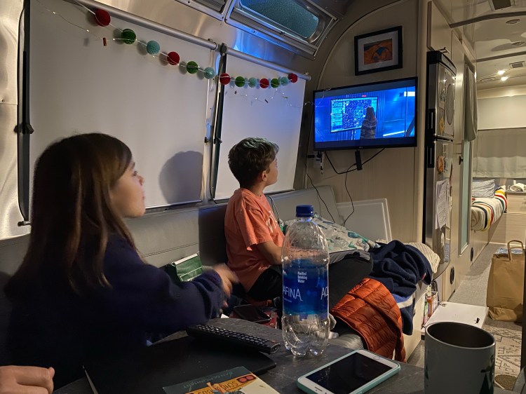 We planned to do the 940 mile drive in 2 days with an overnight in Amarillo, where we had hoped to connect with some dear friends, but we were derailed by terrible weather in Lubbock. It was late in the evening and we could see precipitation of some kind falling – like a sleet/rain mix, but traction on the roads seemed ok at our low speeds until we reached line of sight of a bridge where an accident had occurred; a small car had spun and smashed into the guardrail. We immediately engaged 4 wheel drive and white knuckled it to the next exit. Potentially icy roads weren’t something we wanted to confront while towing ever, but especially not at night. As we exited, we spotted the bright lights of a truck stop and felt deep relief. We pulled in between a couple of 18-wheelers, hopped into the Airstream, and were immediately surrounded by the comforts of home. Movie night!