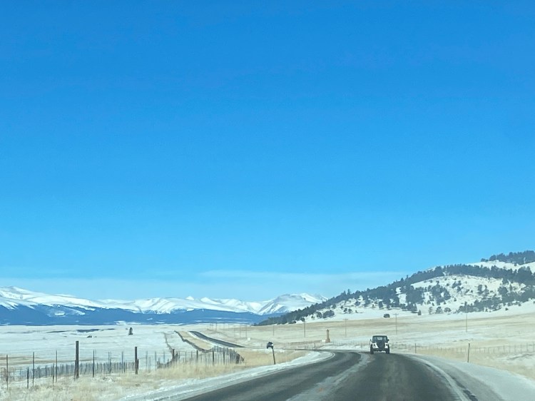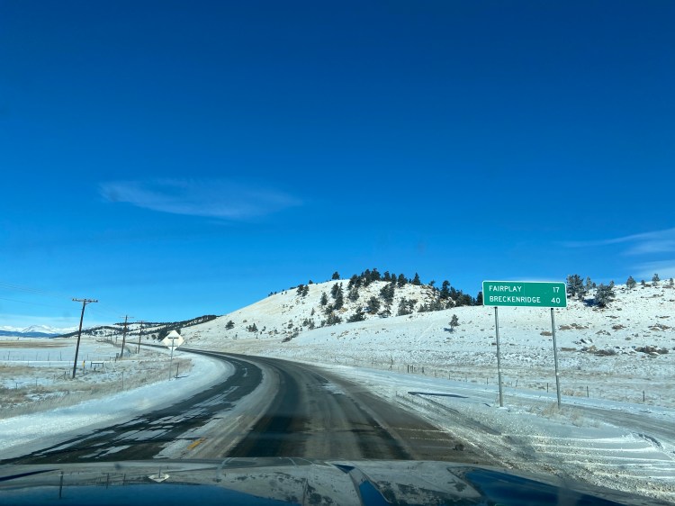 The next day was now even longer than we’d originally planned, and we didn’t want to tow through Hoosier Pass into Breckenridge after dark. We set out at first light, after giving Emma some time to explore the cotton field behind the truck stop up close, but at the first intersection we came to, we must have hit some ice. Tim braked and we felt the whole rig sickeningly slide ever so briefly. It wasn’t a serious loss of purchase, but it was sobering, and with temps set to be cold all day, we knew we were not going to make good time. We were flabbergasted that Lubbock didn’t do a better job salting and plowing the roads – north Texas routinely gets freezing weather; there’s no excuse for inadequate winter maintenance of roads with speed limits up to 80 mph. We resigned ourselves to the very real possibility that we wouldn’t arrive in Breck on the day we’d scheduled — but being able to be flexible is a gift of this kind of travel and we are coming to really embrace it.