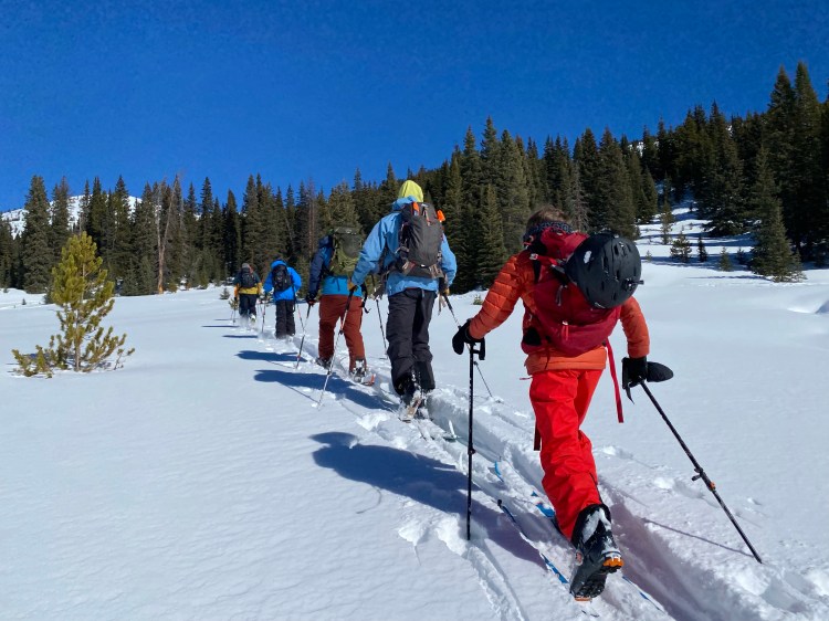 By contrast, touring ski setups have adjustable bindings (with uphill/free-heel or downhill/locked modes) and removable full-coverage skins, allowing you to climb steeper slopes with your skins on and heel free and then “transition” at the top of the slope, removing the skin and locking in your heel for the descent. Cross-country skis have no such transition; they’re optimized for trails with a smaller range of slope angles (less steep, in other words a less extreme ascending/descending differential). Emma’s Baldy Ridge post offers her take on the uphill/downhill transition process that is unique to alpine touring equipment!