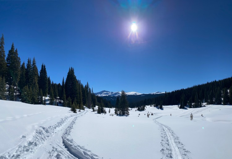 Because an alpine touring ski setup is a little different from cross-country skis, it would take some inventiveness to make this work. I try not to be a purist about gear or techniques – skiing has evolved over millennia from its origins as an early mode of human transportation and as such, I think it should be embraced in more practical and accessible ways. The modern conception of skiing as a luxury sport relegated to resort areas with expensive high-tech gear is incomplete. When we visit museums (like the Breckenridge Visitor Center or the Treads of Pioneers museum in Steamboat Springs) and look at skis from a century ago, we marvel at how sturdy humans figured out how to navigate snow-covered terrain on what were essentially planks of wood they strapped to their shoes – opening up a whole new world of winter possibilities. Fortunately, I had a terrific instructor at the Breckenridge Nordic Center who shared my scrappy attitude and was happy to help with my unorthodox experiment.