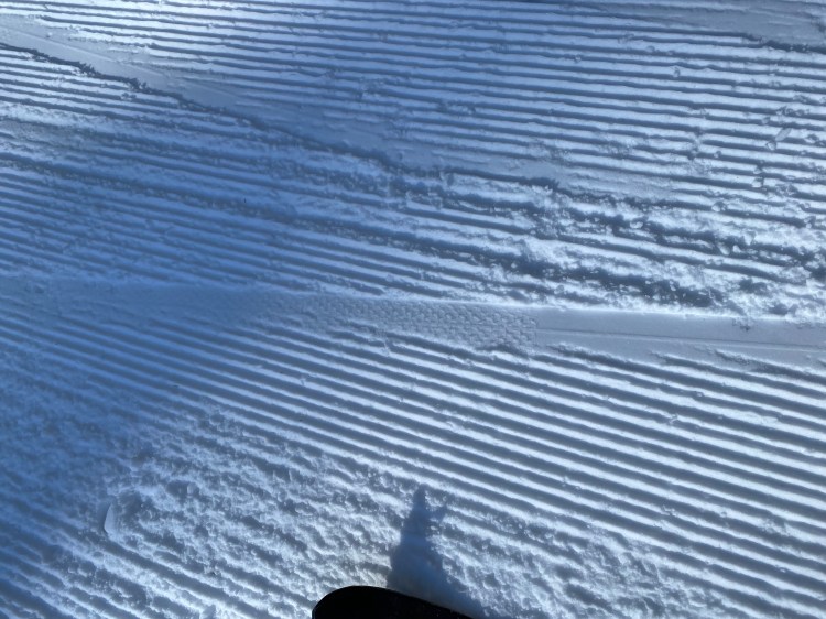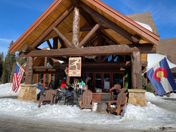 Here’s what I learned from my instructor, who cross-country skied in college in Wisconsin and now lives in Denver, commuting to Breck one day a week to teach at the Nordic Center. Traditionally, there are two styles of cross-country skiing. Skate-skiing is a more intense and full-body movement not unlike how downhill skiers sometimes navigate flats around base areas, with really aggressive poling and a wider stance. Skis for this style of skiing have no grip on the bottom, so to climb hills, skate-skiers have to aggressively push off each ski, keeping it at an angle to avoid slipping back downhill. Momentum helps too, so you are thinking about using terrain to optimize speed. Trails groomed for Nordic skiing have a wider area of flat corduroy for skate skiers, and to one or both sides will be deep grooves for classic cross-country skiers, who keep their skis in the tracks and use only a parallel/forward gliding motion. Classic cross country skis have some grip underfoot to allow them to climb hills – but the rest of the ski is smooth to allow glide.