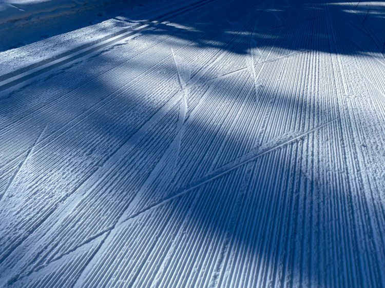 My instructor gamely offered suggestions for navigating trails using different techniques and gear settings and we experimented to determine what worked best. Of all the variations, I found that keeping the skins on and staying in the parallel tracks allowed for easy climbing/walking but slower progress in terms of covering distance (much less glide since my skins cover my entire ski) and that skate-skiing (no skins, heel free) was the hardest technique to master especially on inclines/declines and the most intense in terms of cardiovascular output but offered the best potential for covering flatter terrain quickly.