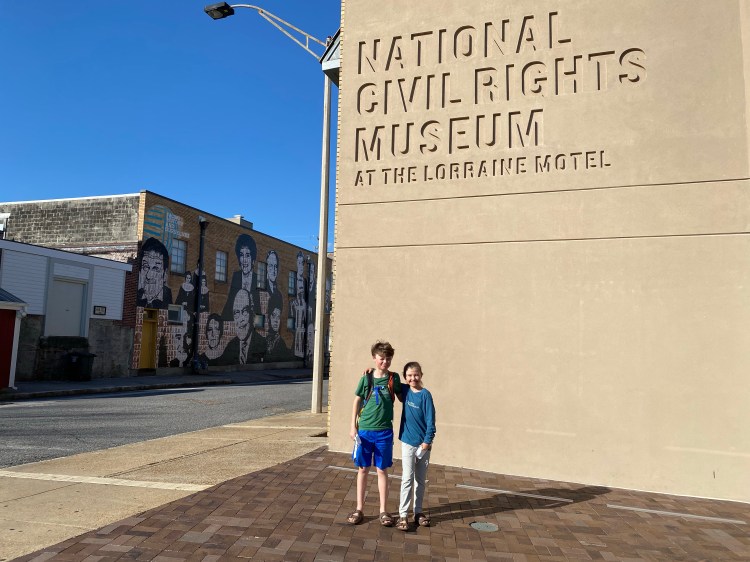 Here in Memphis we began our journey along the U.S. Civil Rights Trail. We first visited the Slave Haven Underground Railroad Museum. This museum is housed in a former private home that was recently discovered through oral family history to have been an important stop on the underground railroad. Nothing was written down because it was too dangerous. The house was even built for this purpose, set out in the woods, away from the town, within a couple of blocks of the river. Enslaved people used the river to travel north — after the passage of the Fugitive Slave Act they had to get all the way to Canada or they could be caught in the northern states and sent back to slavery. They could stop along the way at this house for food, supplies, rest, and information. A lawn jockey holding a lantern on the porch was a symbol. If the lantern was lit, it was safe to approach the house and ask for help. If not, this was a sign of possible danger. Some other signs of safety are a magnolia tree, which is evergreen and a sign that the people inside the house will help (“look for the green tree”). Also, quilts hung strategically on clotheslines were used: various patterns from Africa communicated messages to the enslaved people to help them plan their escape. The house had a tunnel leading to a crawl space underneath, ranging from 2 feet to 6 feet high with a dirt floor for fleeing people to hide until they were ready to go to the river and continue on. While the underground railroad is more a network of houses and people than any physical structure, if there is a physical representation, it is the Mississippi (and Ohio) River.